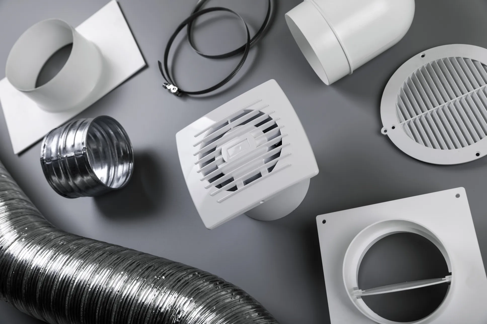 Gamme complète de bouches d'extraction, conduits, filtres et composants techniques assurant une installation solide et fiable sur le long terme.